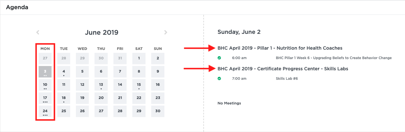 From here you can click on any of the Monday squares with dots. (Remember, the dots are an indication that something is happening/happened on that day, the solid gray is today’s date.) Clicking on this will bring up that day's lesson content on your screen. This will contain information on your lessons for that week, your Skills Lab, and also your Office Hours should you have one scheduled. If you click on the lesson description for that week, in this example it is BHC Pillar 1 Week 6, it will take you to the location of that week’s course videos.