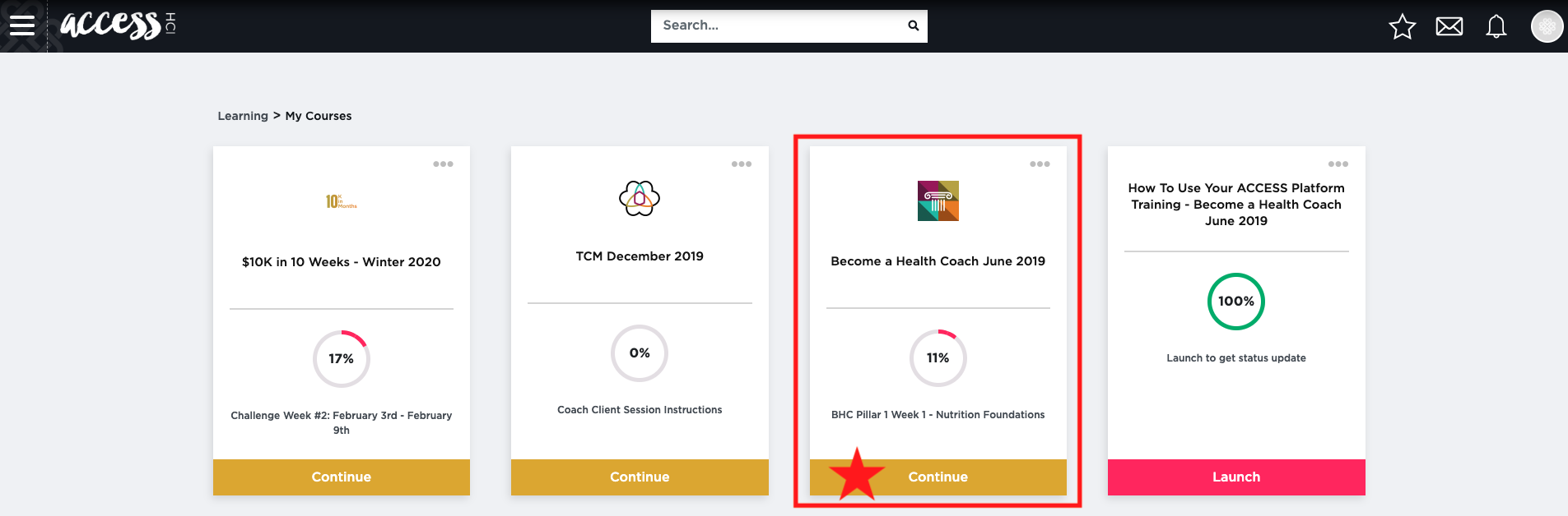 You will now see the My Courses page that houses all of the courses that you are enrolled in. For this example, we will be using BHC June 2019. When you see your desired course, click the Continue/Launch button.