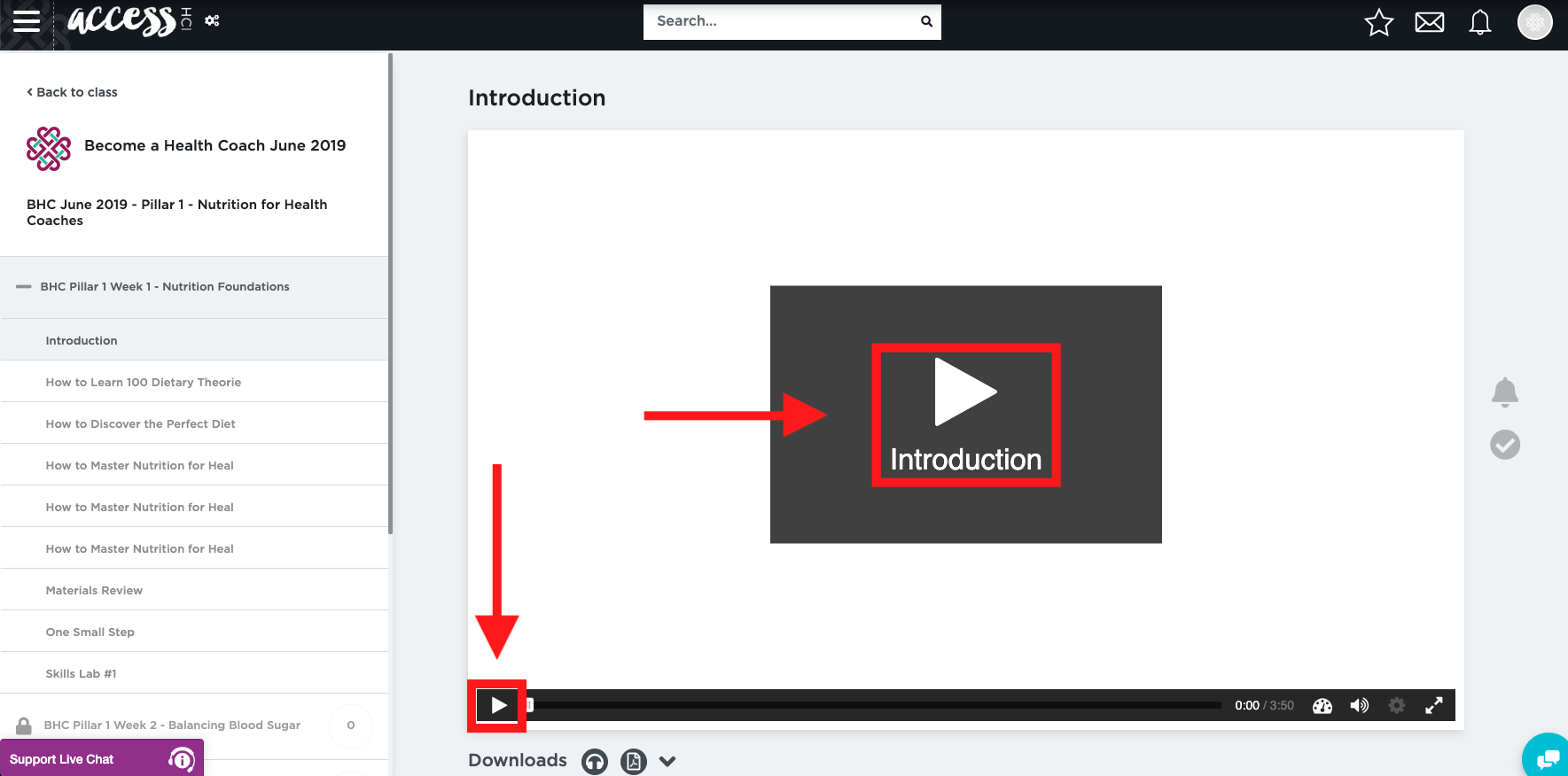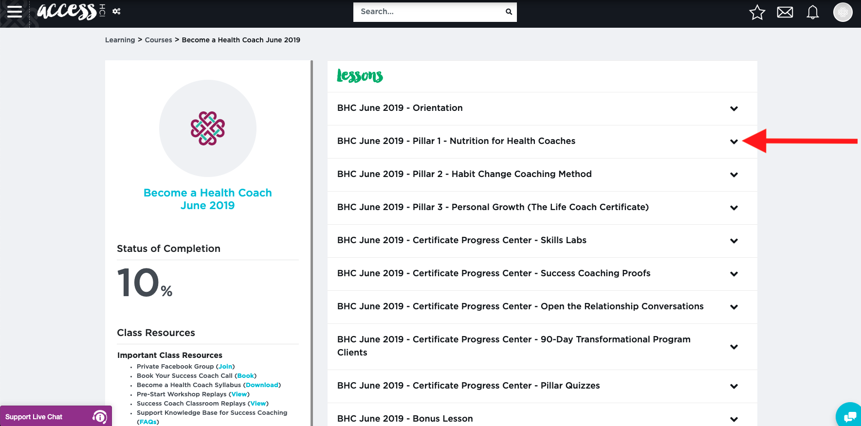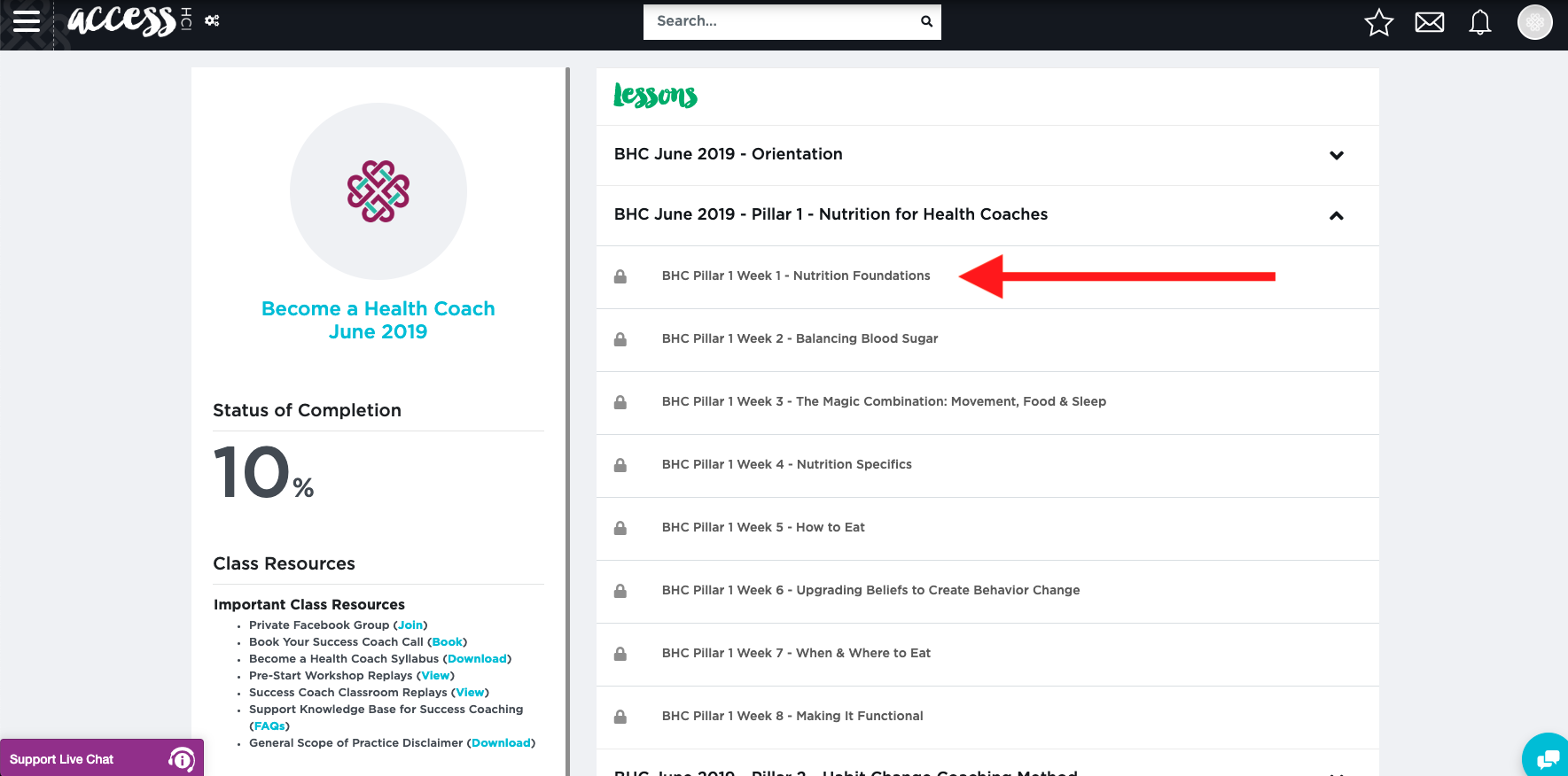 To find your course videos, simply scroll down and click “BHC [enter class] - Pillar 1 – Nutrition for Health Coaches” or "BHC [enter class] - Pillar 1 - Nutrition, Health & Wellness". The title may very depending upon when you enrolled.