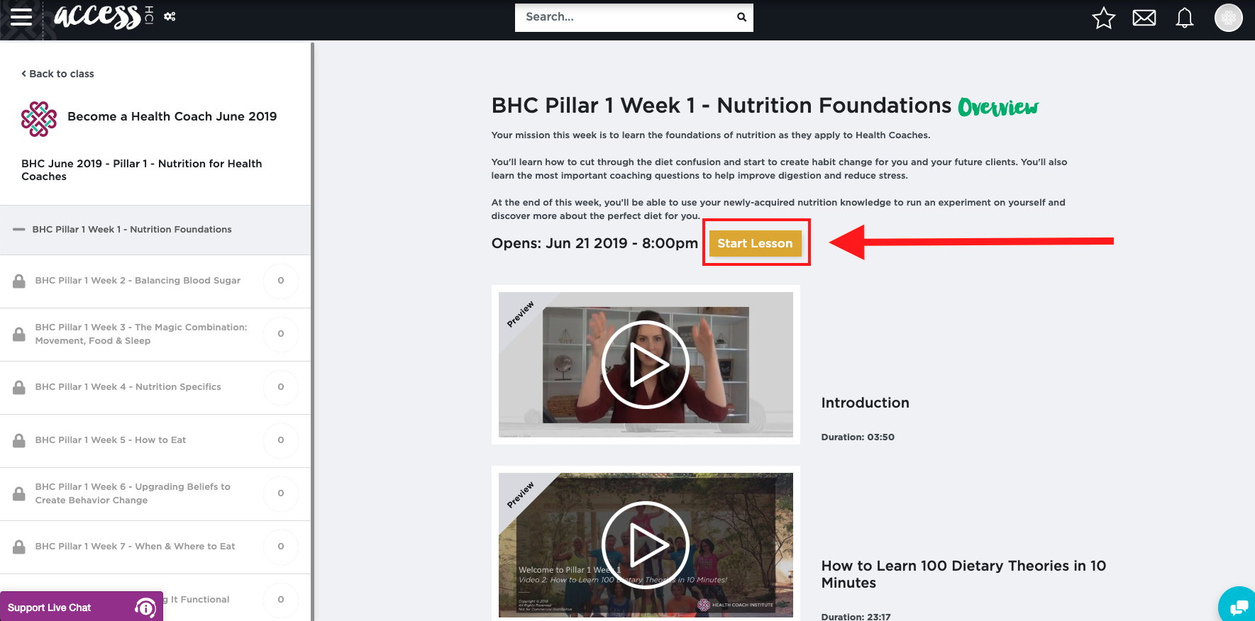 Using either of the above methods will bring you to the below page for the relevant Pillar and Week’s content. To begin the videos, simply click on the yellow "Start Lesson" lesson button in the middle of your screen.